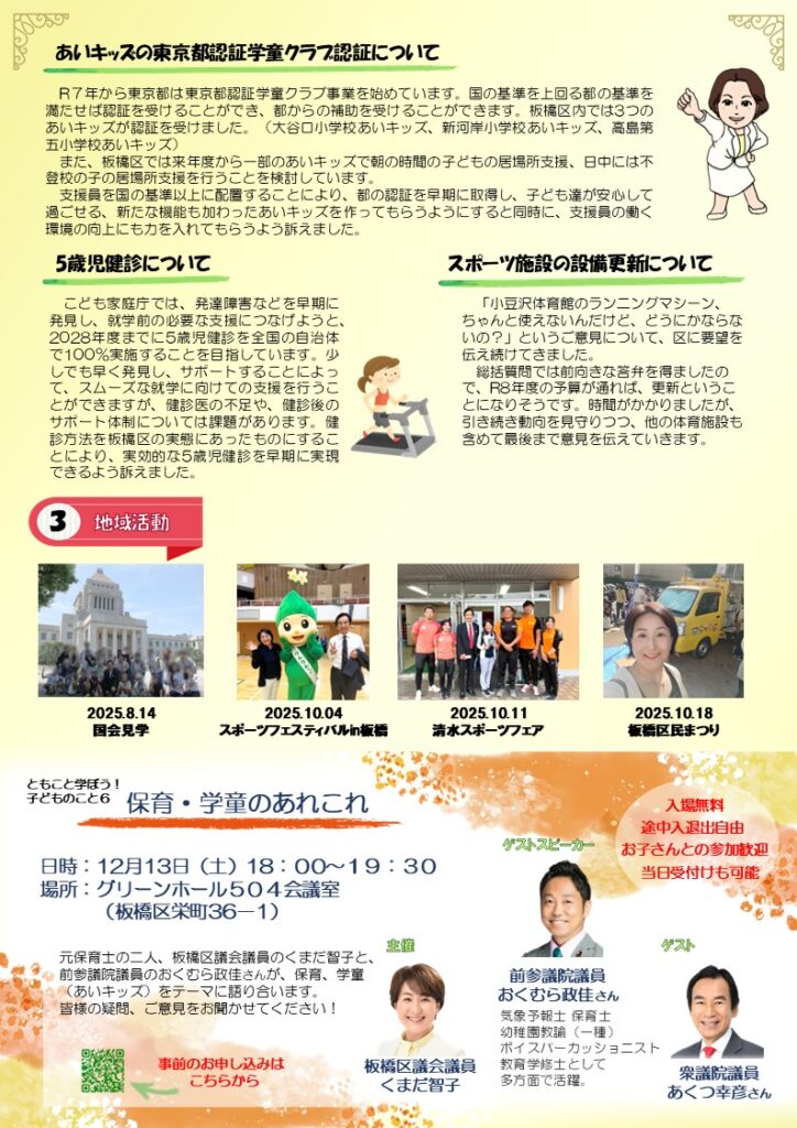 区政レポート Vol.8をUPします。第3回定例会、決算調査特別委員会の内容を中心に報告しています。たくさんの方の目に留まりますように! お知らせ この記事が気に入ったら フォローしてね! Follow @KumadaTomoko よかったらシェアしてね! URLをコピーする URLをコピーしました! URLをコピーしました! 2025.10.29 港区立の学びの多様化学校「Minato School」視察 2025.11.01 学習会「保育・学童のあれこれ」を行います! 関連記事 2025.11.01 学習会「保育・学童のあれこれ」を行います! 2025年11月3日 【区政報告会】8月16日、くまだ智子とおしゃべり会を開催します。 2025年7月25日 2025年7月25日 区政レポートNO7をUPします。 2025年7月25日 2025.5.31 夜間の避難所開設訓練(清水地区) 2025年5月31日 2025年4月20日 みんなで話そう! 保育のこと 2025年4月19日 2025年3月27日 区政レポートNO6をUPします。 2025年3月27日 2025.2.26 補正予算 総括質問 2025年3月1日 2024年10月1日区政レポートNo.5 2024年10月1日 コメント コメントする コメントをキャンセルコメント ※ 名前 ※ メール ※ サイト 次回のコメントで使用するためブラウザーに自分の名前、メールアドレス、サイトを保存する。